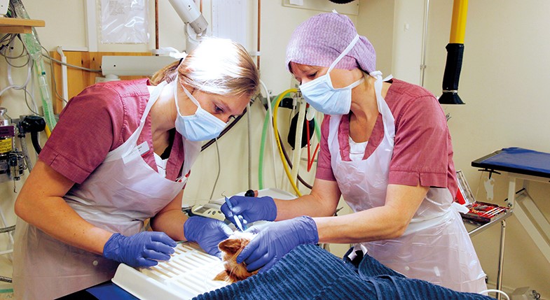 – Flera av oss är vidareutbildade inom tandvård och vi har den utrustning som krävs för att ta hand om det mesta när det gäller behandling av djurens tänder säger Karin.
