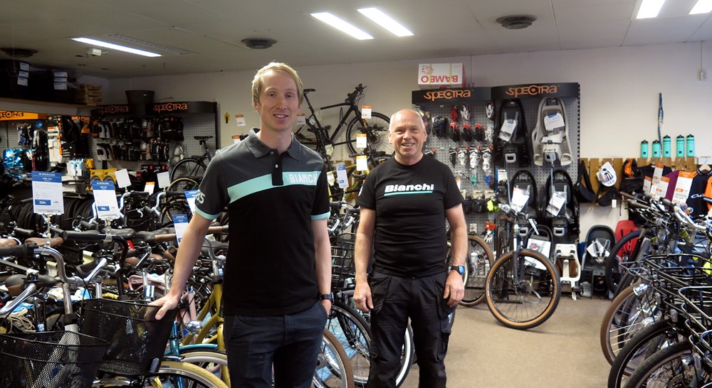 Hos JBC-Sport säljer de också mycket tillbehör och både Emil och Christer turas om att stå i butiken och att vara på verkstaden.