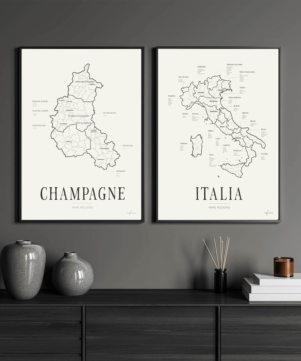 Förutom Corkframes erbjuder företaget även vackra Vinkartor som hyllar några av världens mest ikoniska vinregioner. Kartorna visar detaljerat upp områden som Toscana, Bourgogne och Champagne, och är en perfekt dekoration för alla vinälskare.