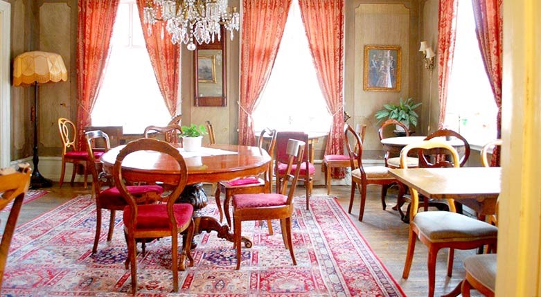 Inredning som möbler och mattor är köpta på olika auktioner för att smälta in i den gamla stil som sätter prägeln på Kullzénska caféet, som än i dag drivs av en av grundarna – Tina Hansson.