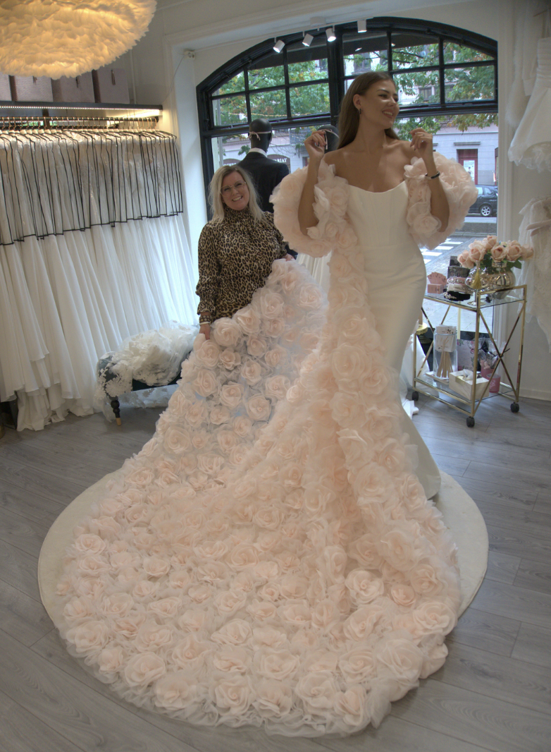 Sedan dess har verksamheten utvecklats till en av Skandinaviens mest personliga och efterfrågade bröllopsbutiker, dit brudar reser långväga. Sortimentet är brett: från klassiska satinklänningar till oväntade inslag som leopardmönstrat eller rosa, en färg som blivit butikens signatur. “Vi vill kunna erbjuda det som inte finns överallt. Det gör att brudar kommer hit även från andra länder”, säger Bella.